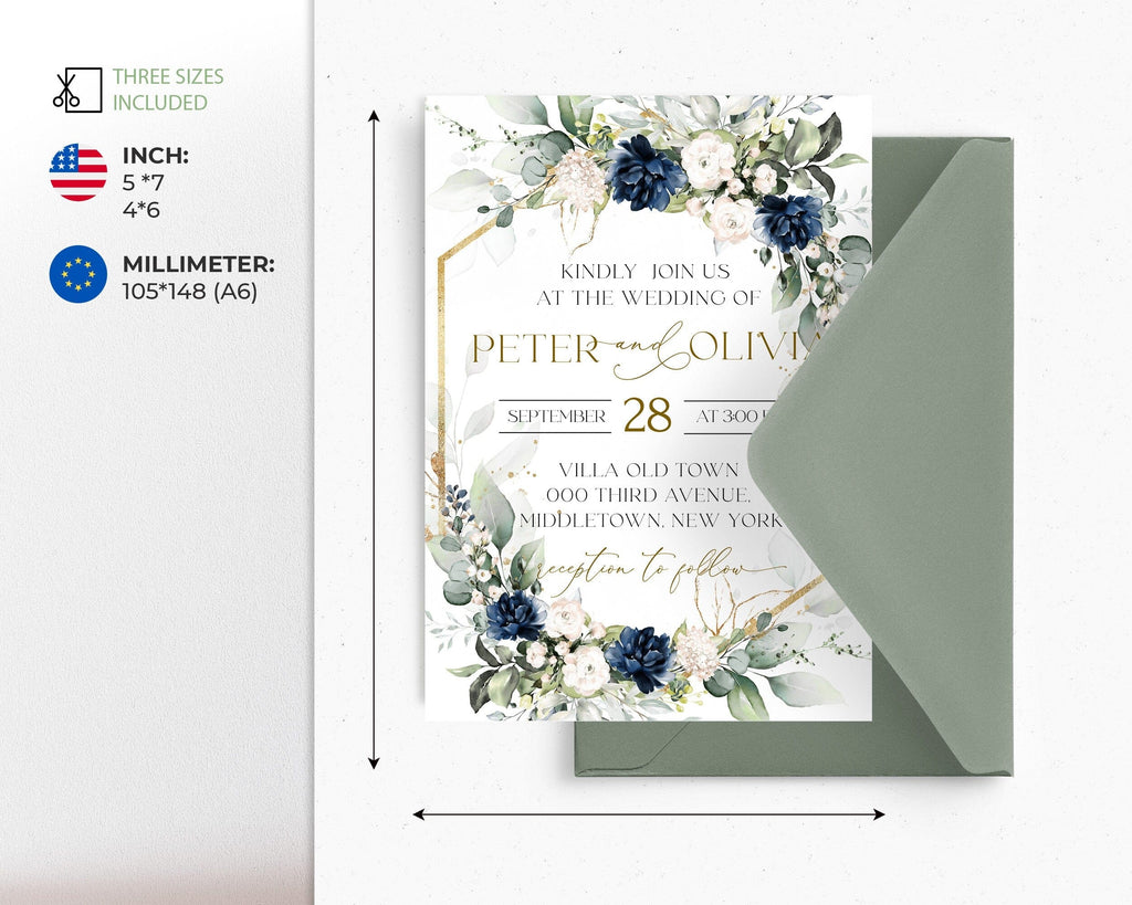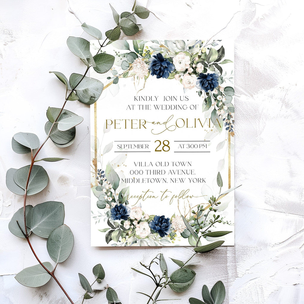 Navy Blue & Gold Wedding Invitation | 3 Sizes | Elegant Floral Invite