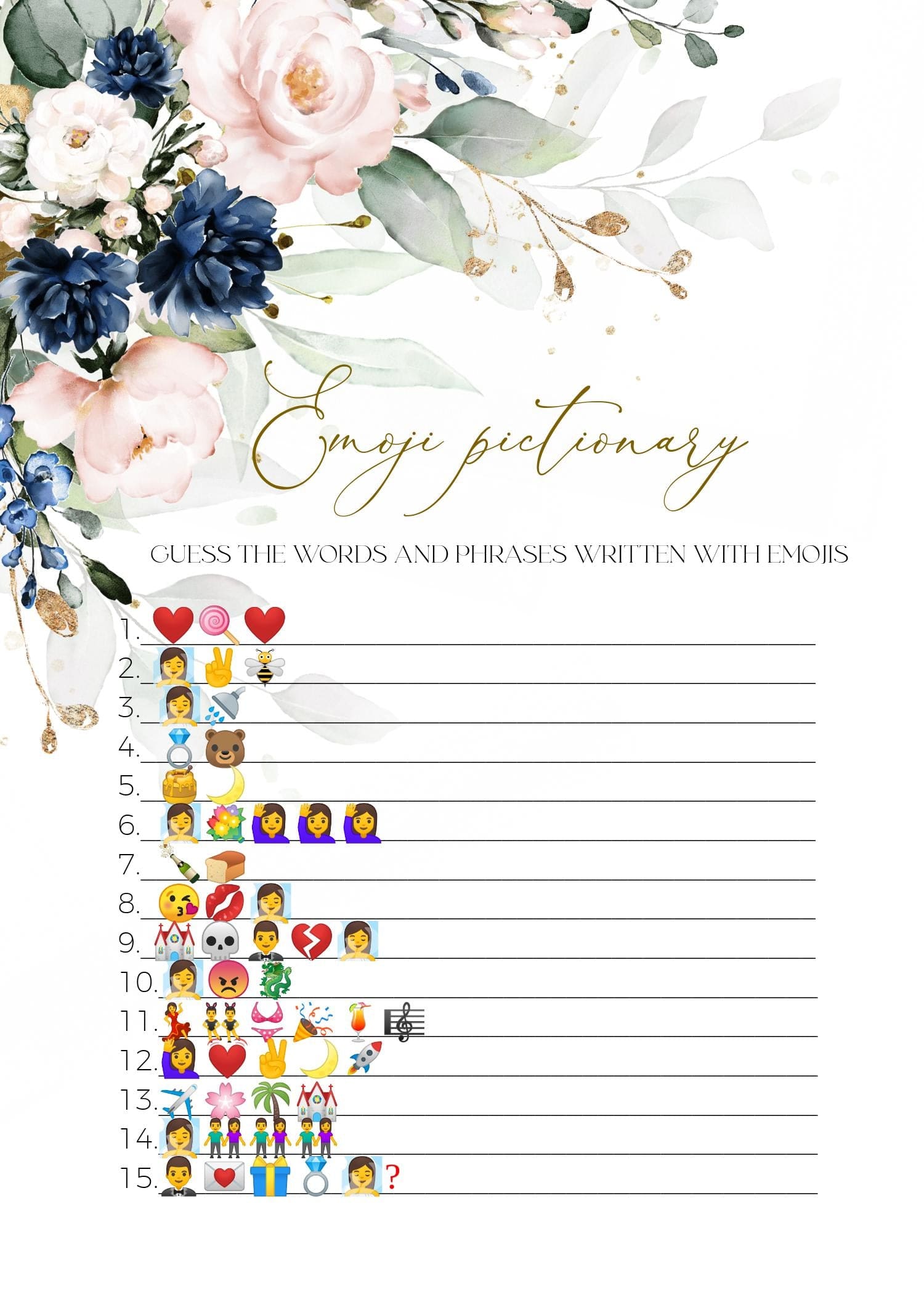 Navy Blush Gold Emoji Pictionary Game | Wedding Guessing Activity