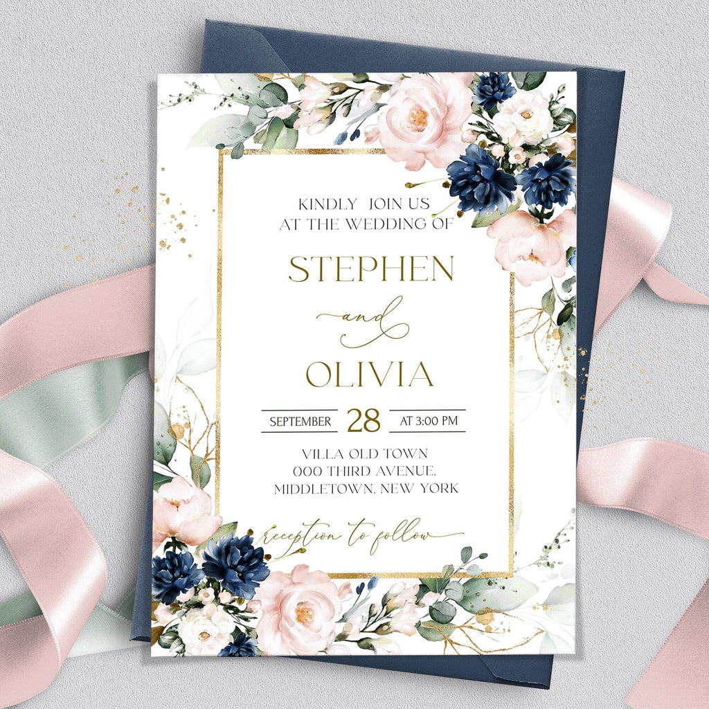 Navy Blush Gold Floral Wedding Invitation | 3 Sizes | Editable Printable