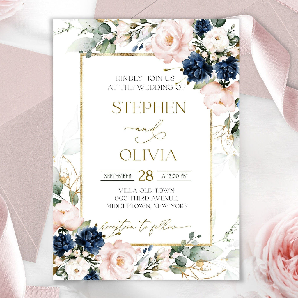 Navy Blush Gold Floral Wedding Invitation, EDITABLE Templates