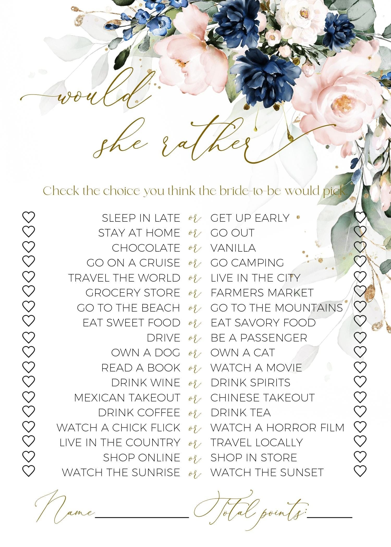 Navy Blush Gold Would She Rather Game | Bridal Shower Activity