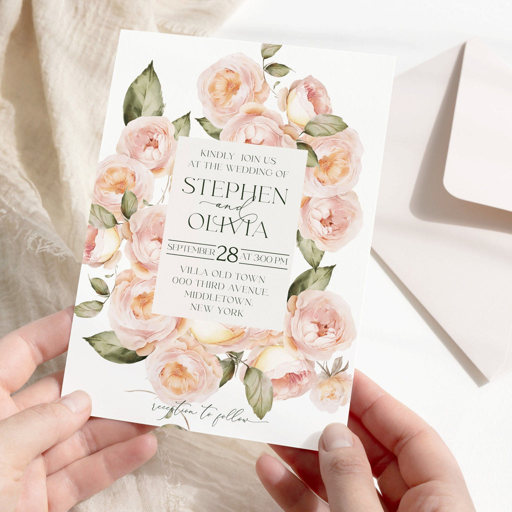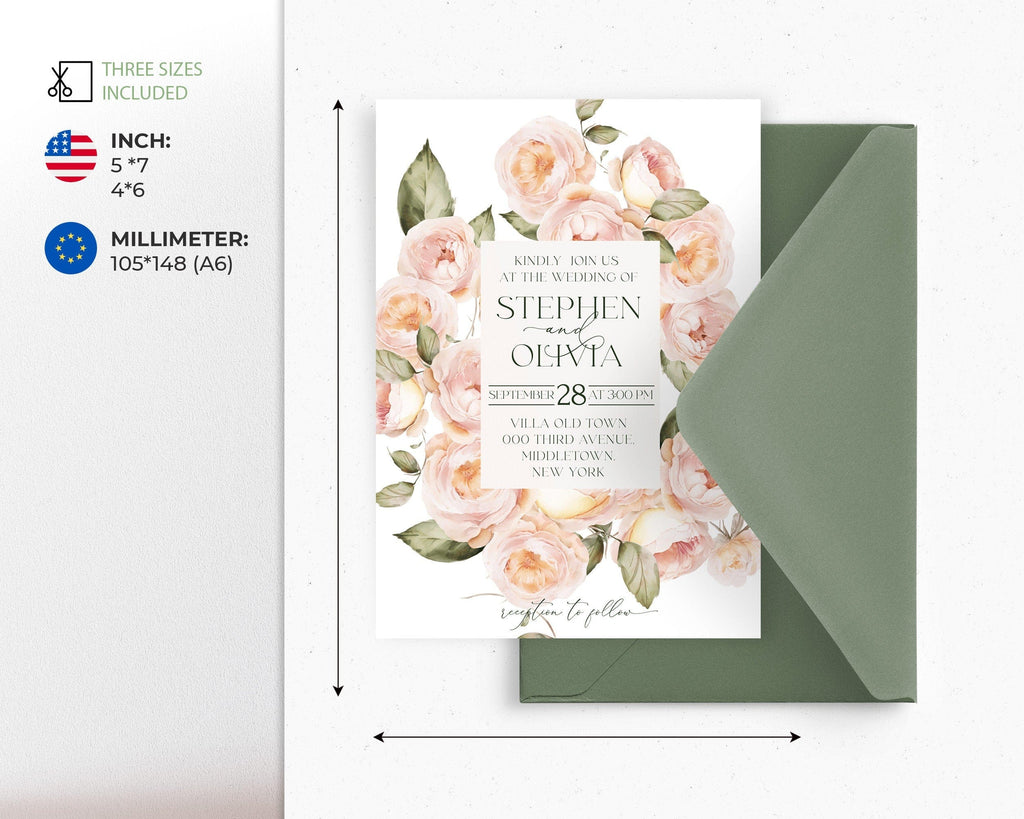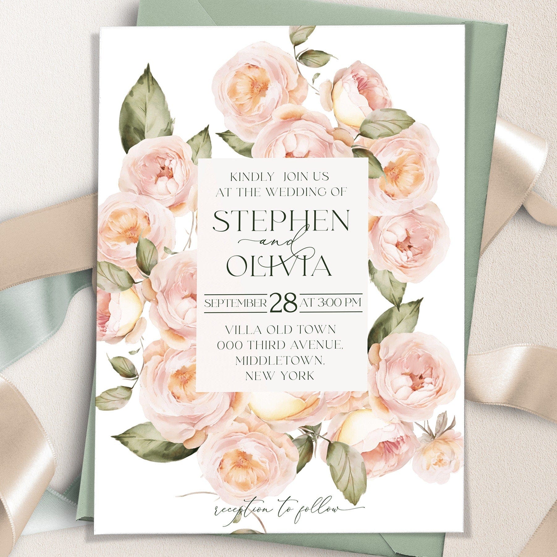 Peach Rose Wedding Invite Cards | 3 Sizes | Elegant Floral Printable Invites