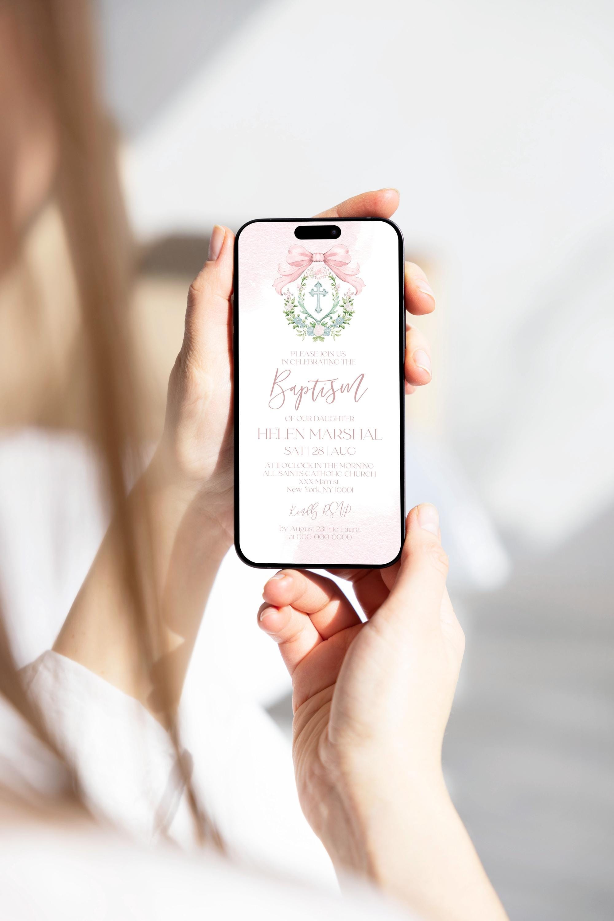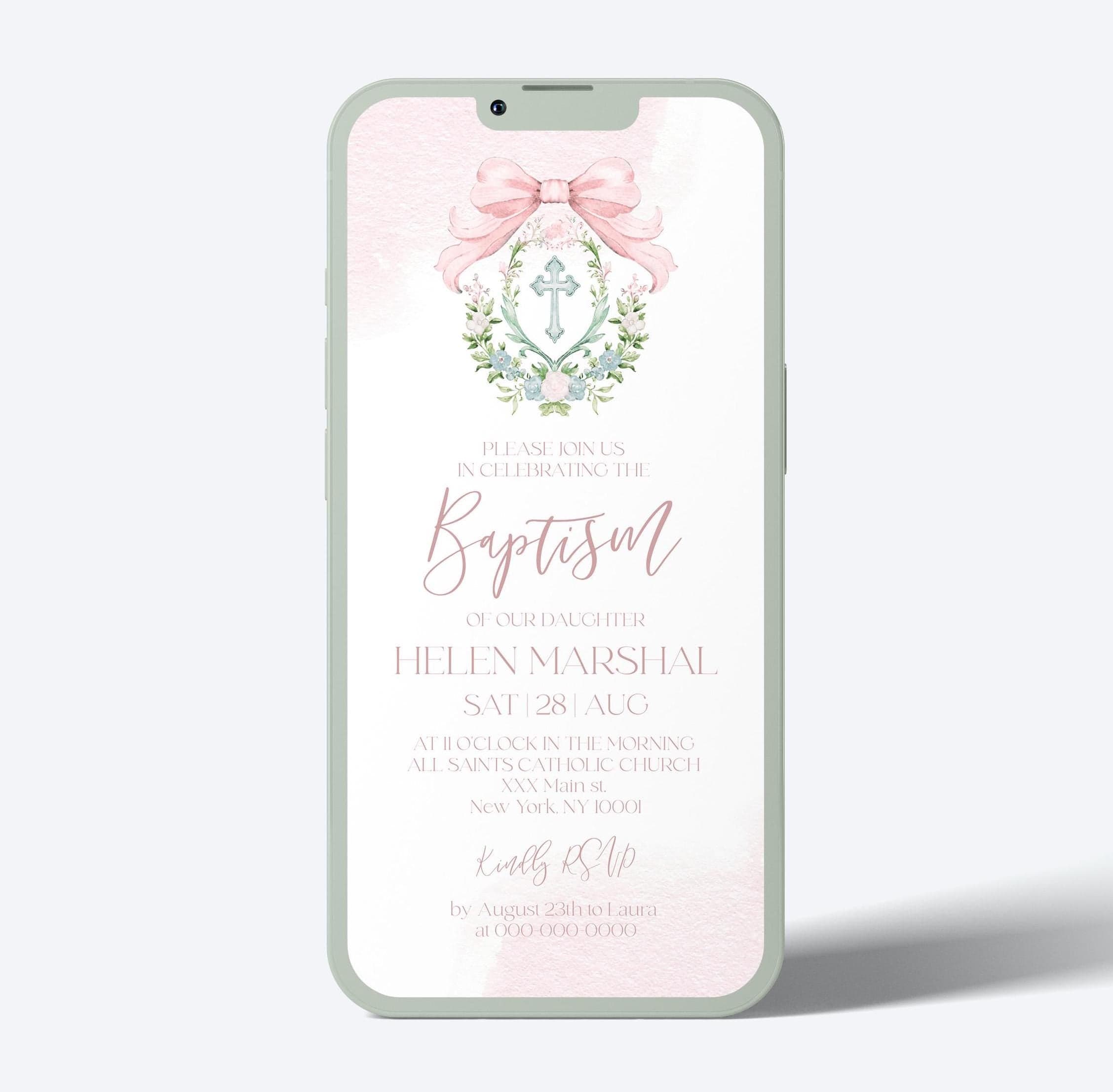 Baptism E-Invitation for Girl Pink Bow Cross Wreath Editable