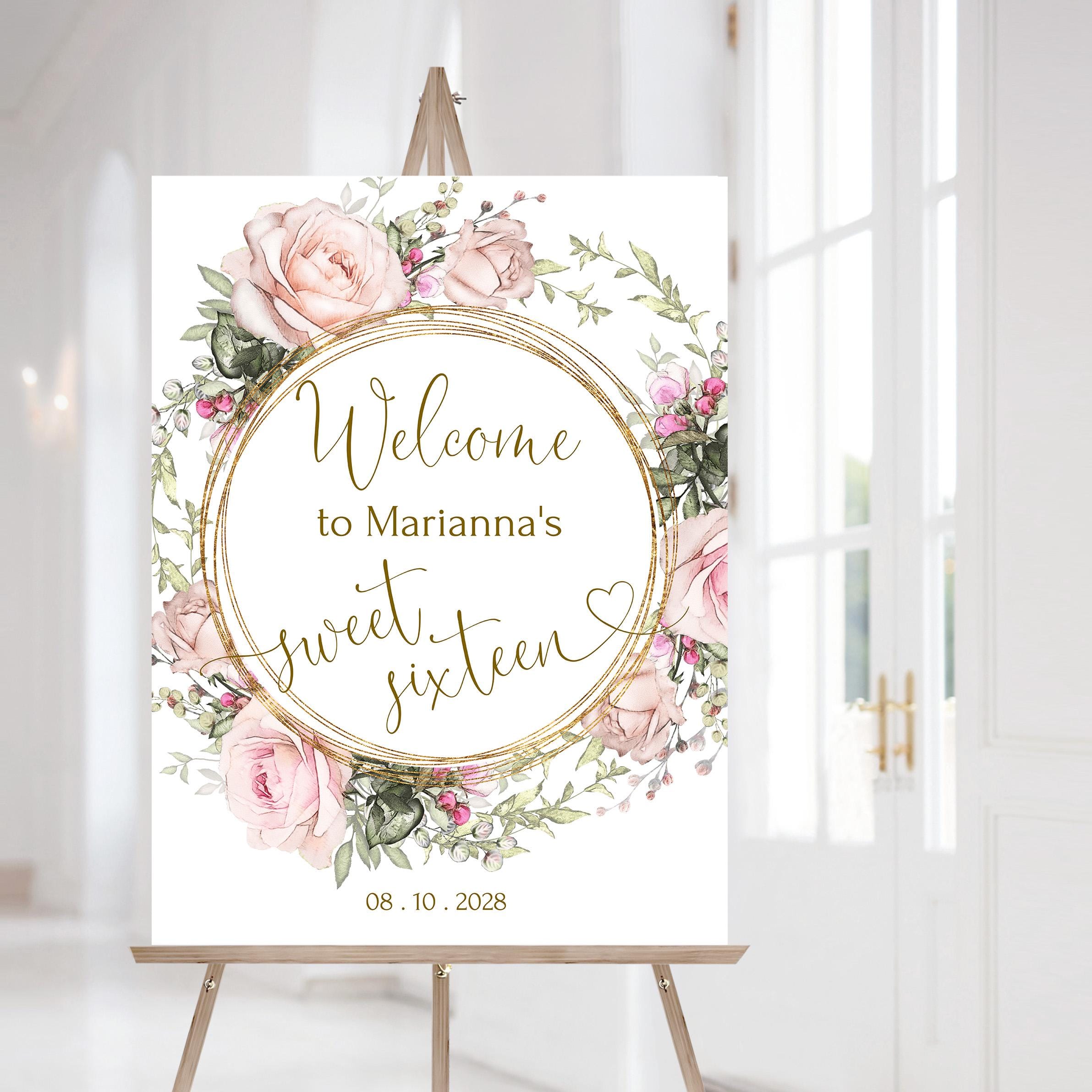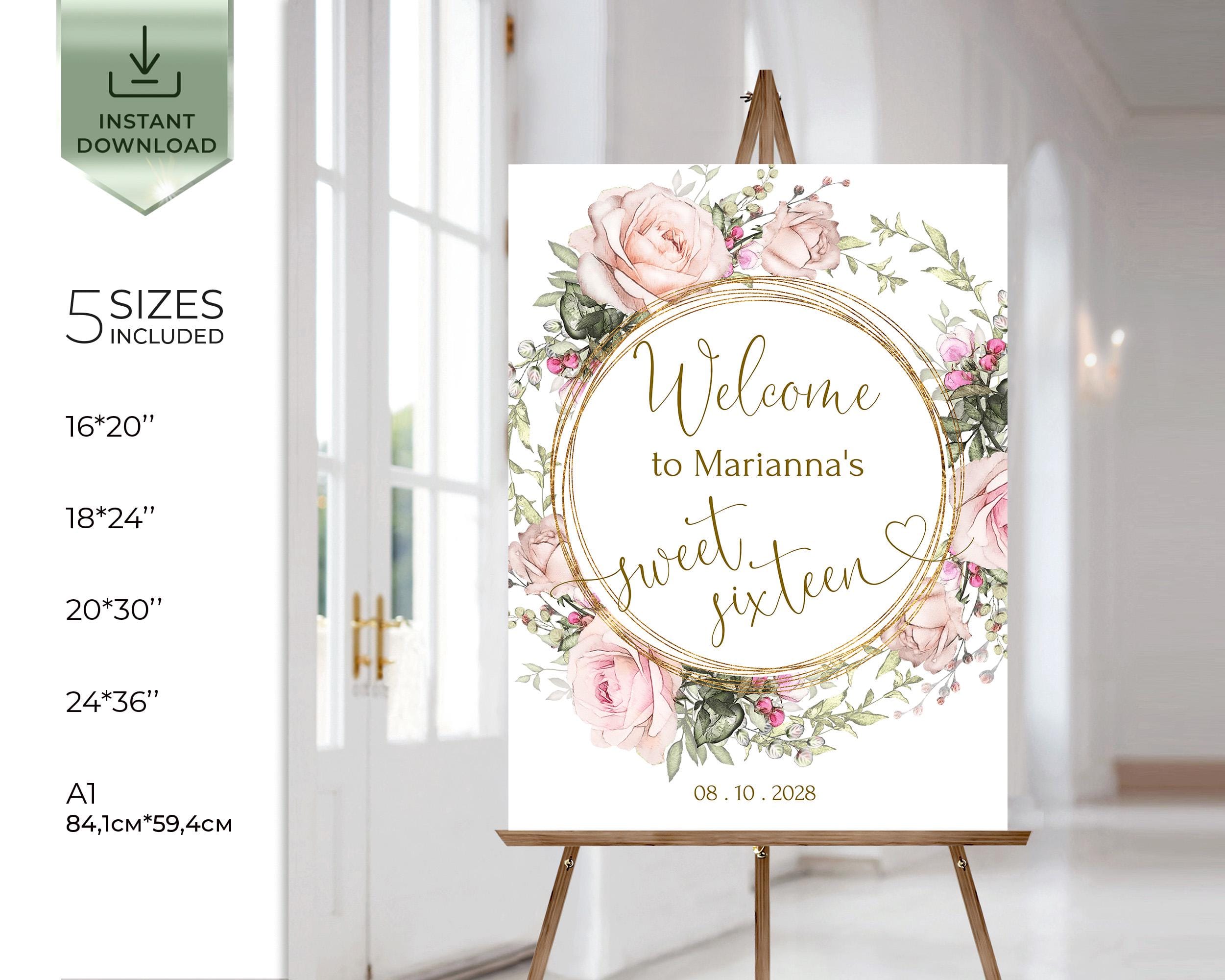 Blush Rose & Gold Sweet 16 Welcome Sign, EDITABLE Templates