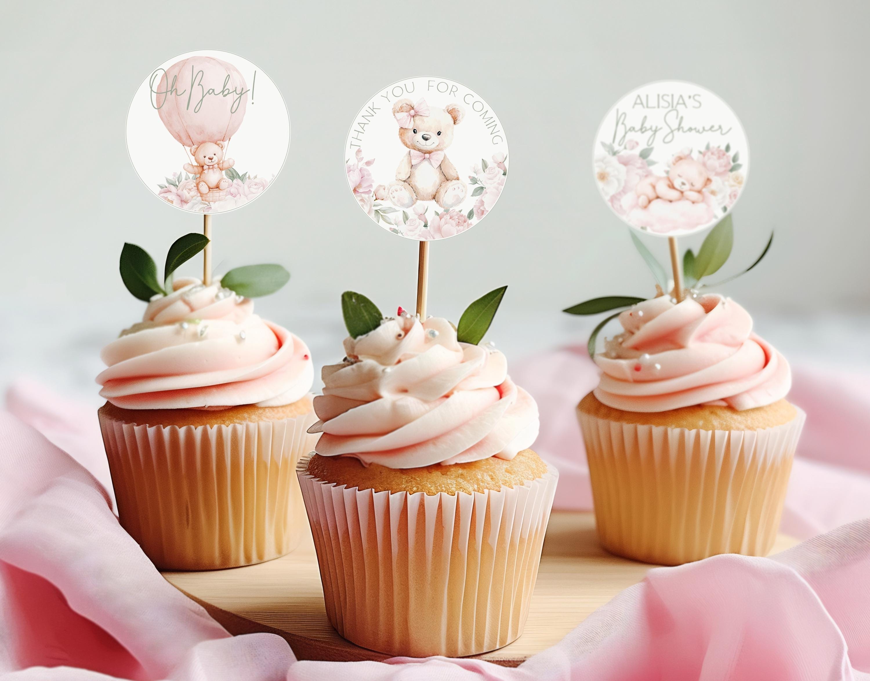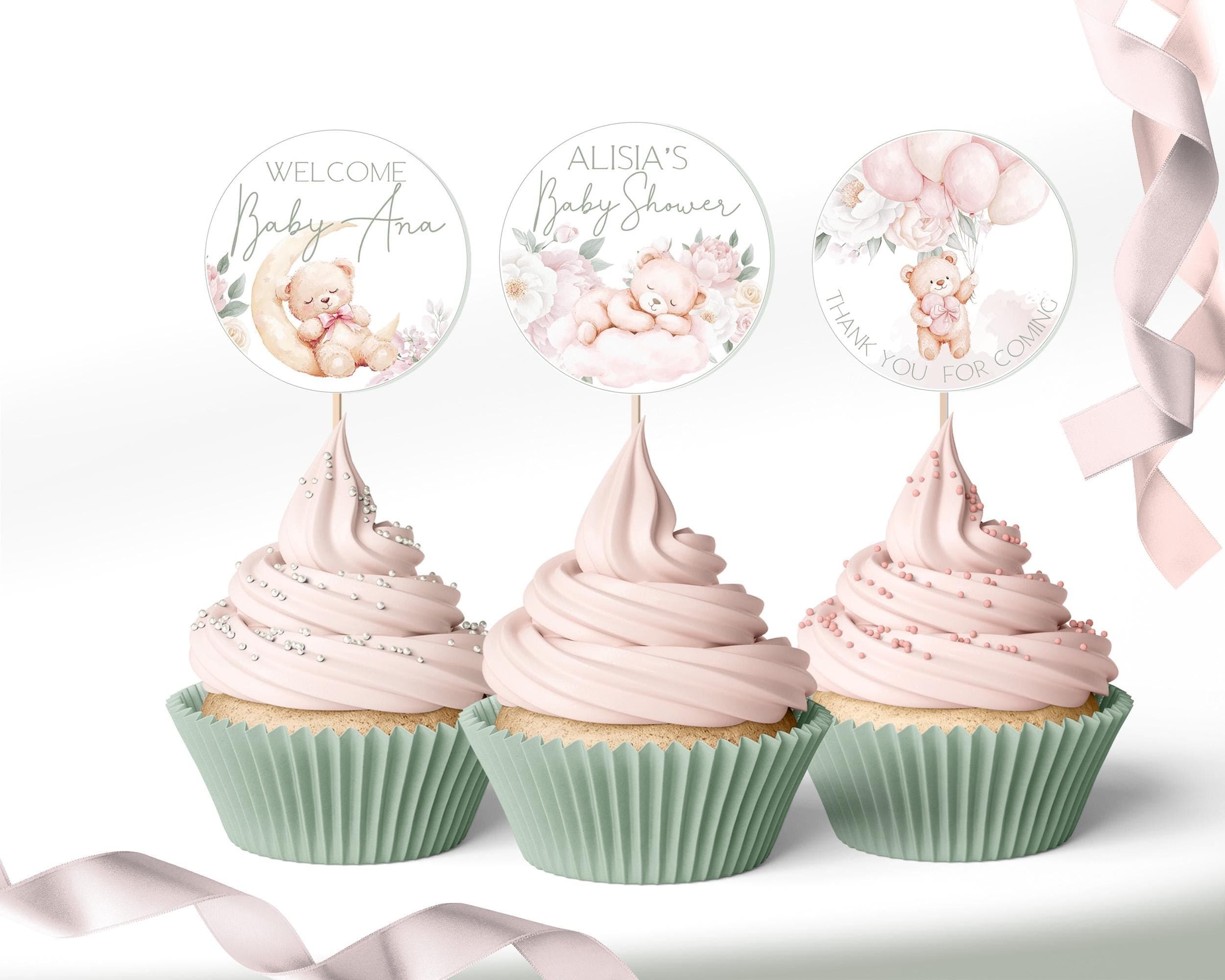 Pink Teddy Bear Baby Shower Cupcake Toppers, EDITABLE Templates