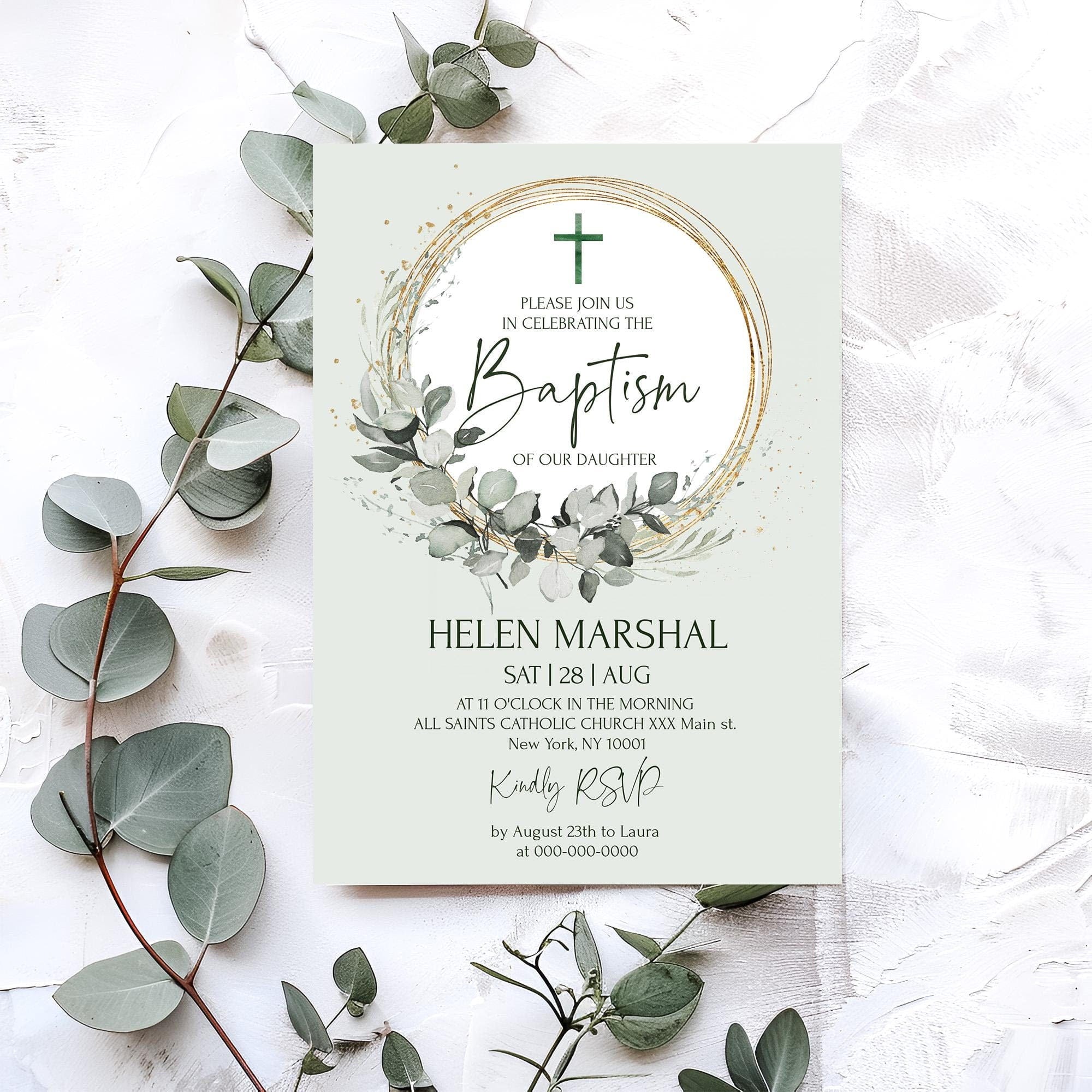 Printable Greenery Gold Baptism Invite, EDITABLE Templates