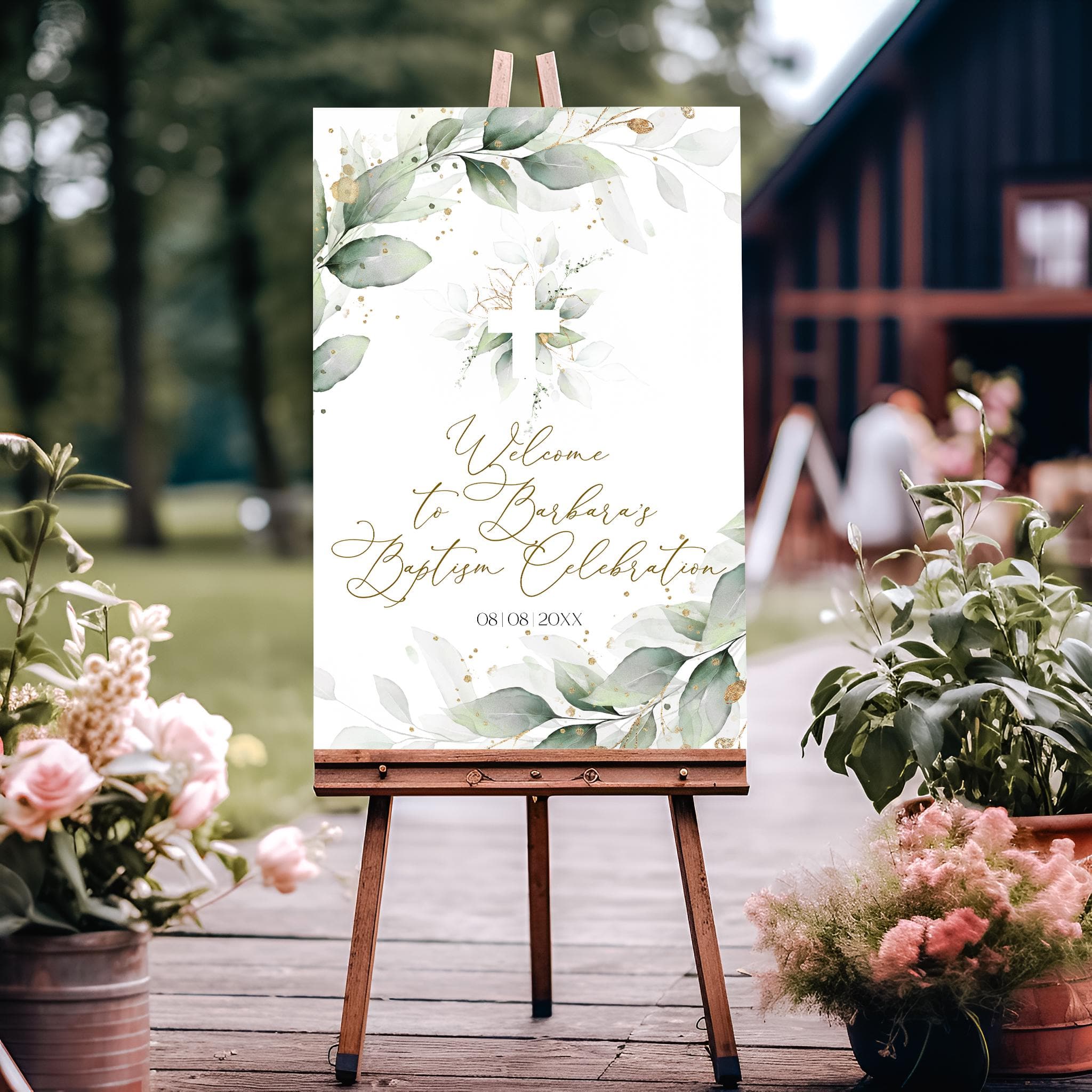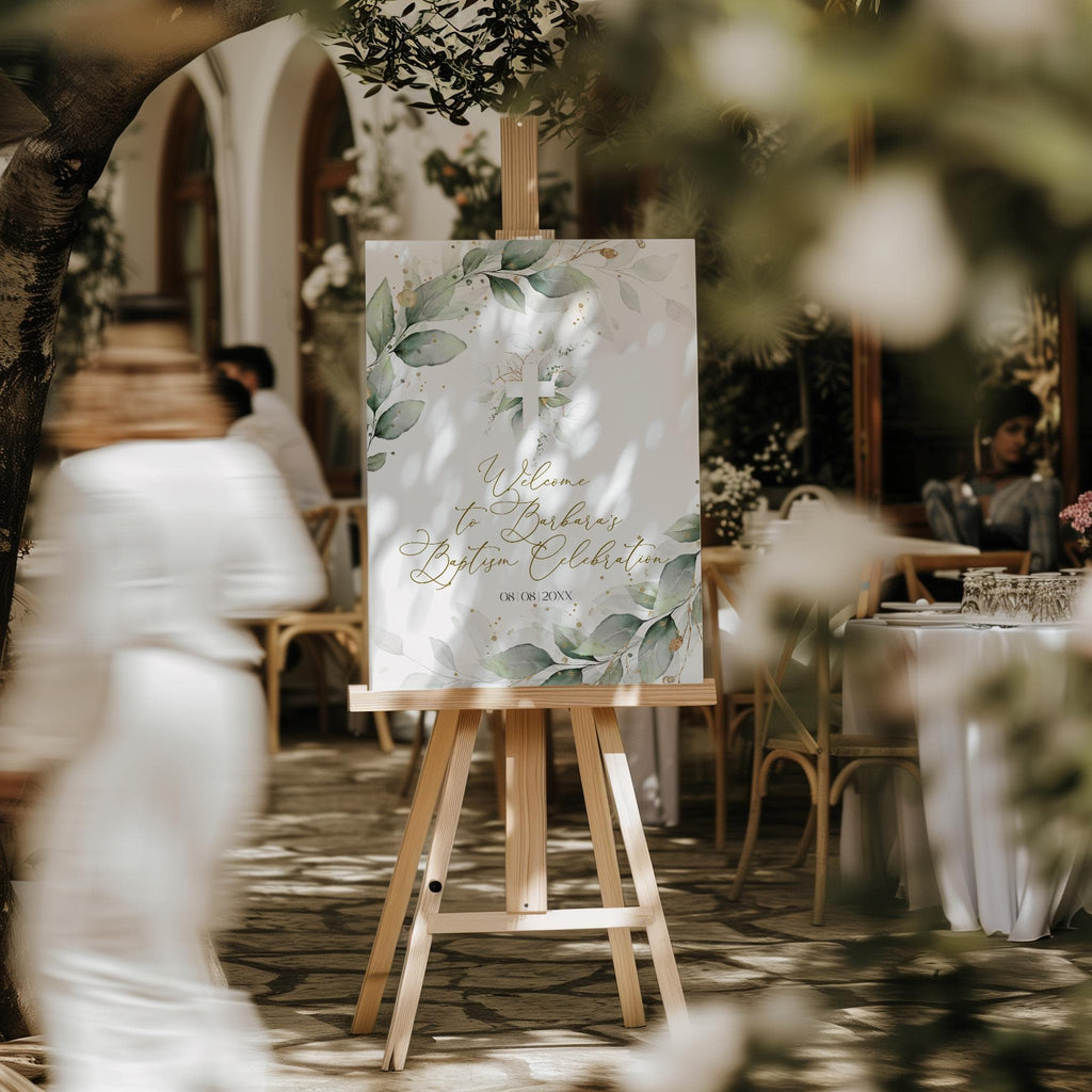 Greenery Gold Christening Welcome Poster, EDITABLE Templates