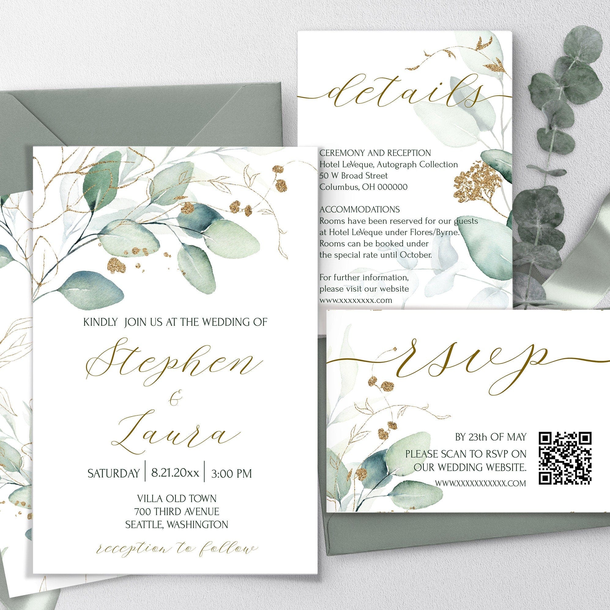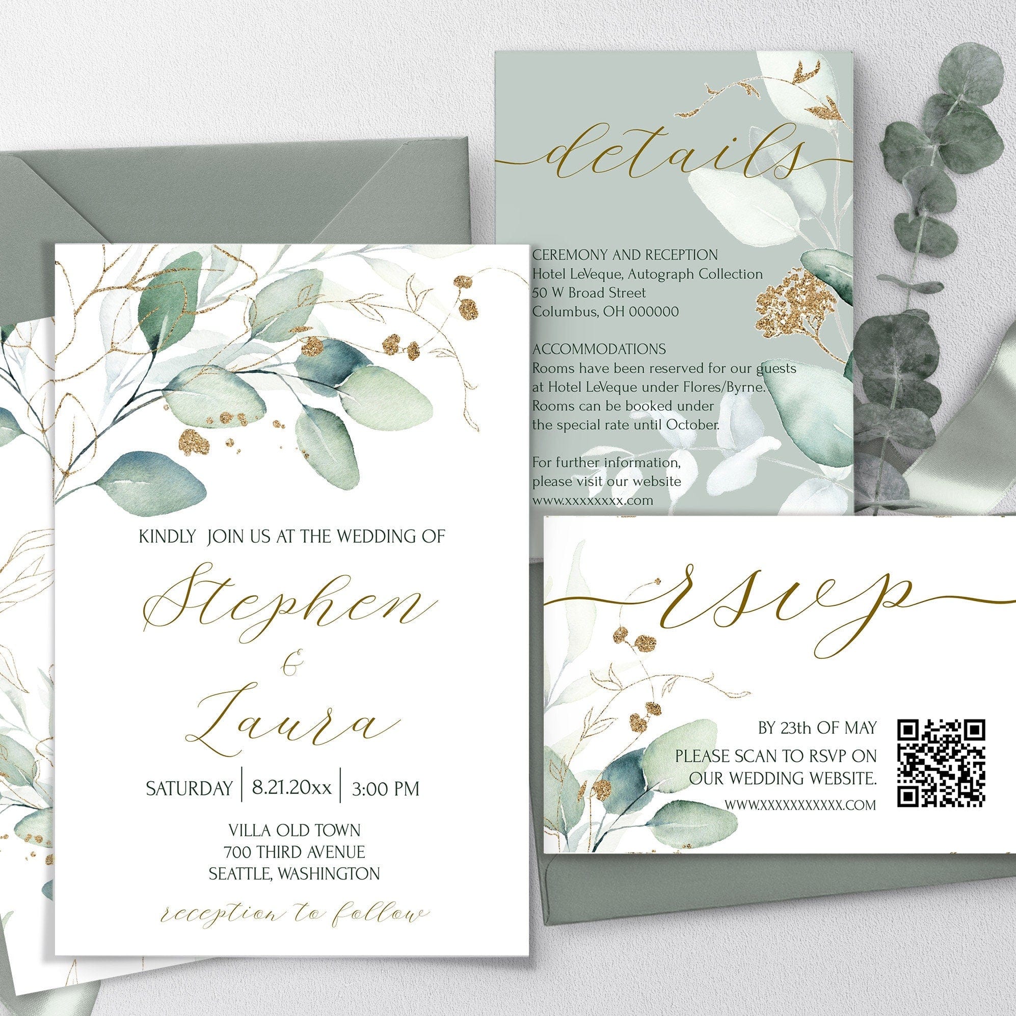Sage Green Wedding Invitation Suite, EDITABLE Templates