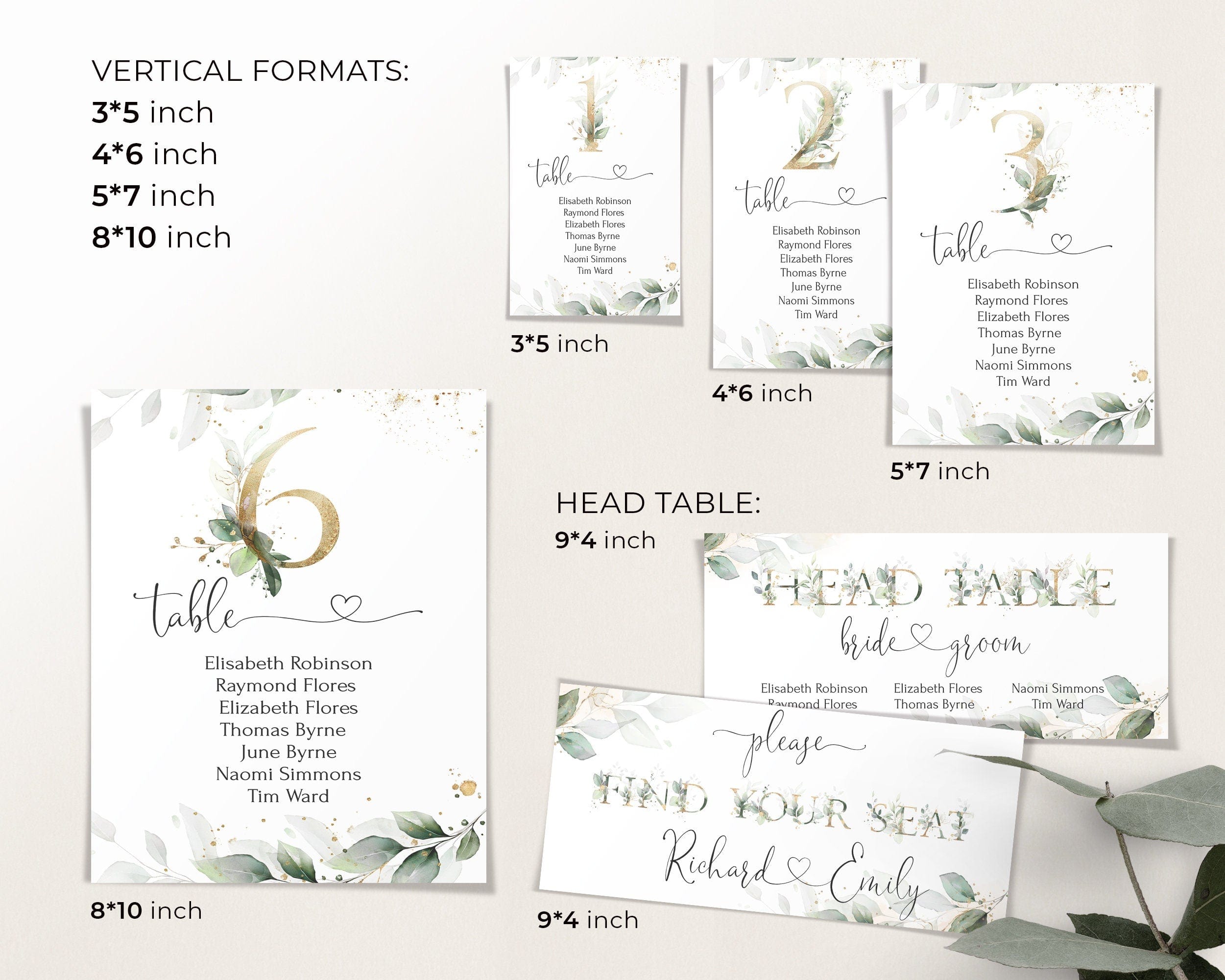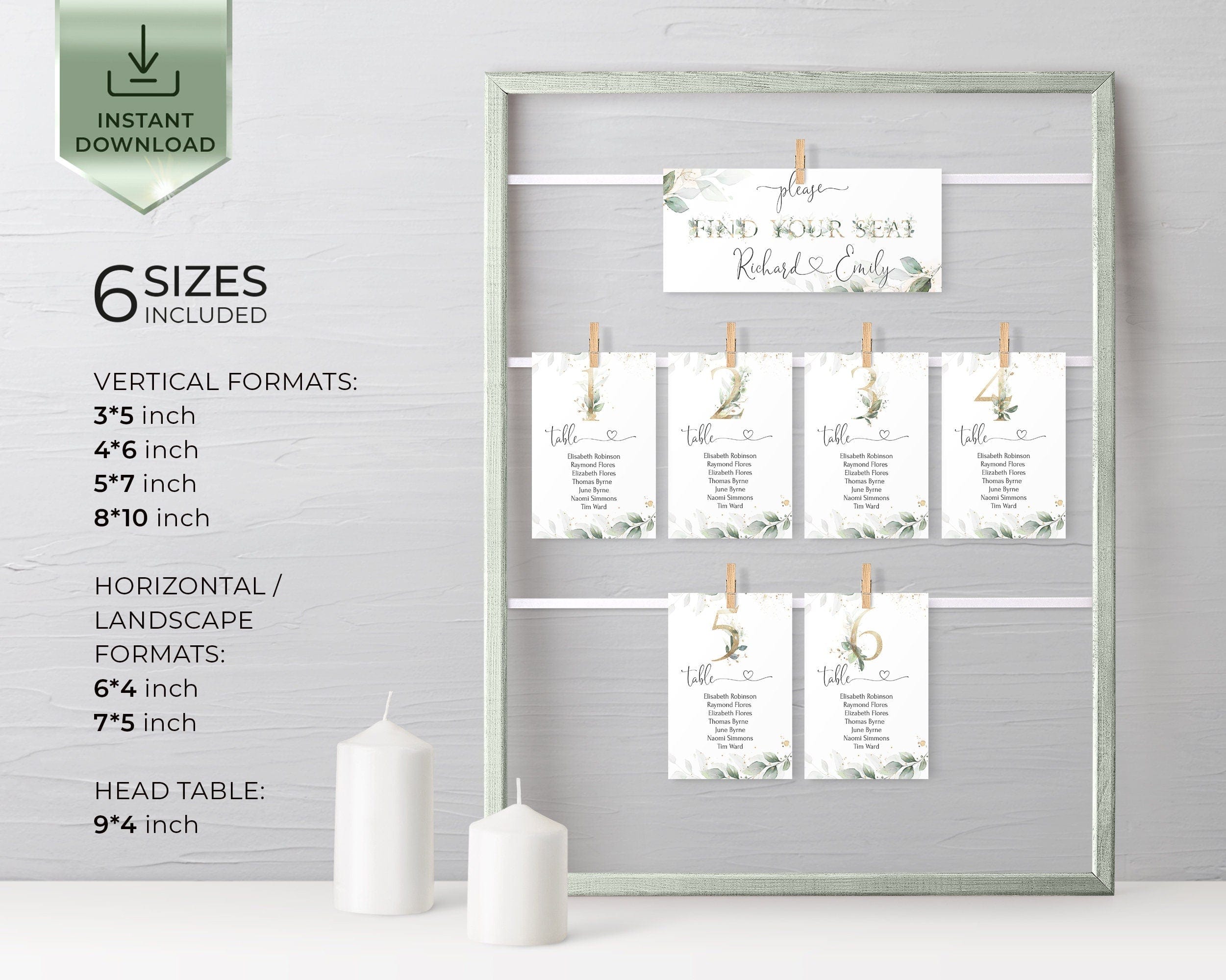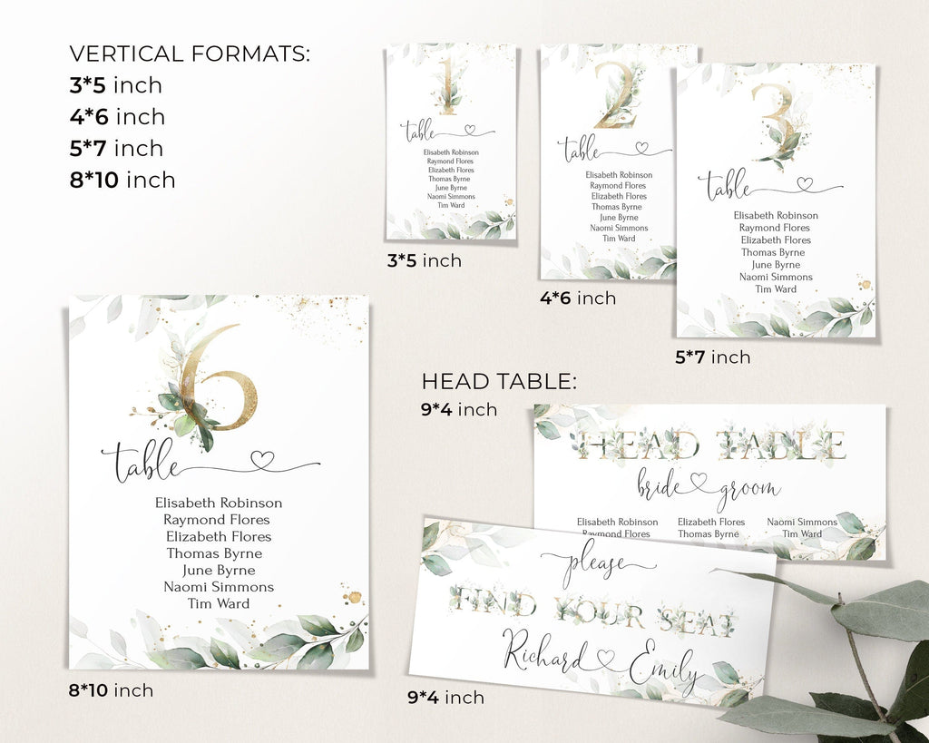 Greenery Gold Seating Plan Cards, EDITABLE Templates