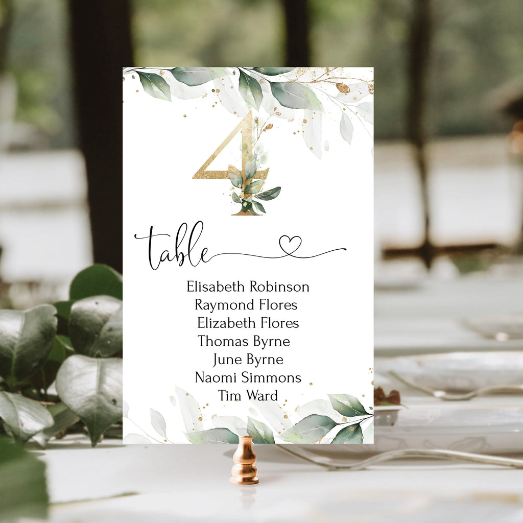Greenery Gold Seating Plan Cards | Eucalyptus Themed Table Assignment Cards