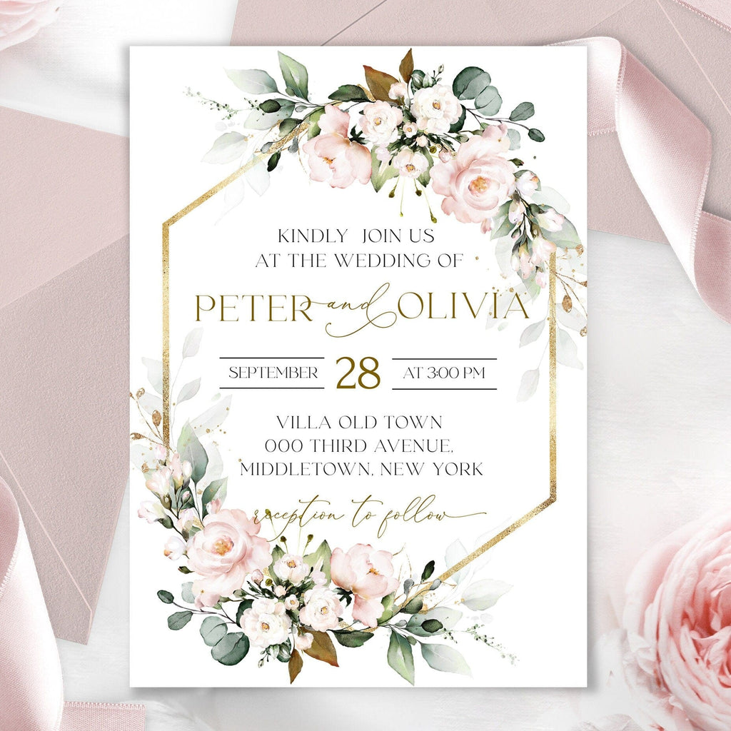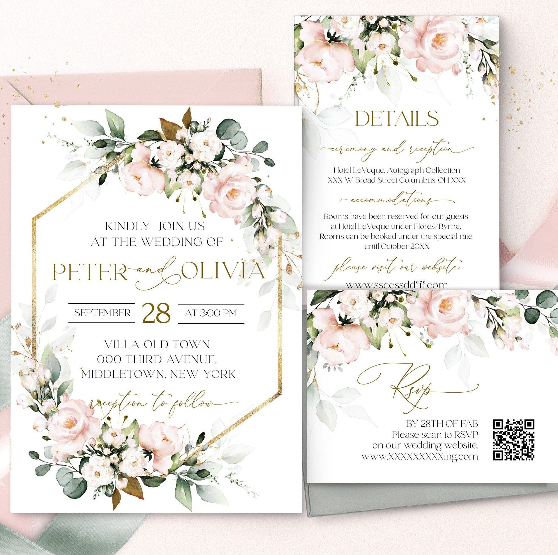 Soft Pink Wedding Invite Suite | Editable Pink Rose Wedding invites Set