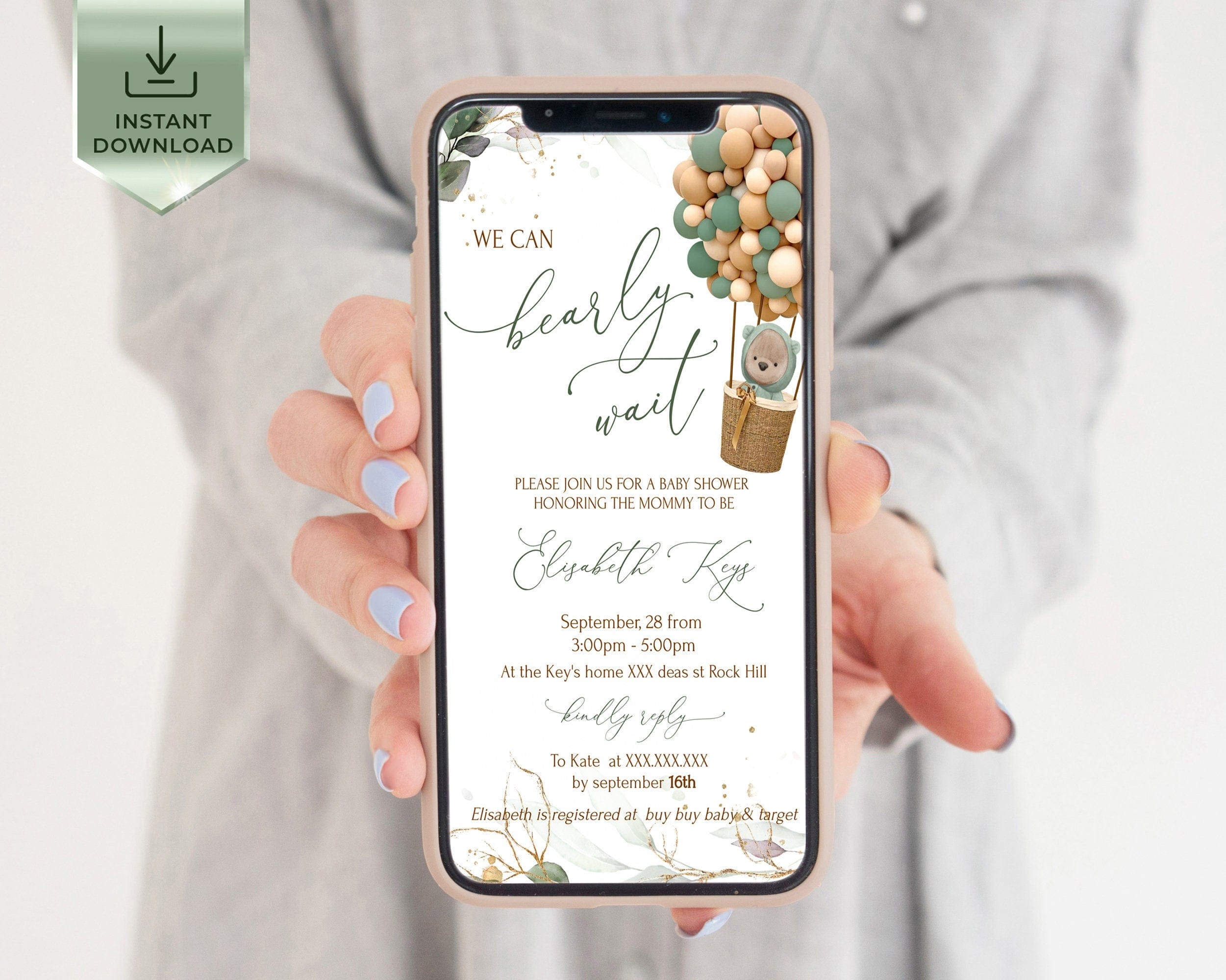 Teddy Bear Baby Shower Digital Invitation with Hot Air Balloon, EDITABLE Templates
