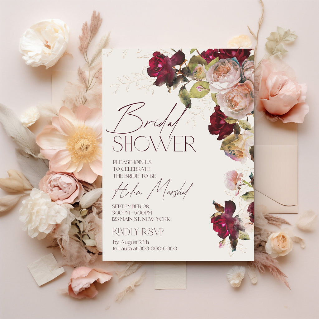Vintage Burgundy & Blush Bridal Shower Invitation, EDITABLE Templates