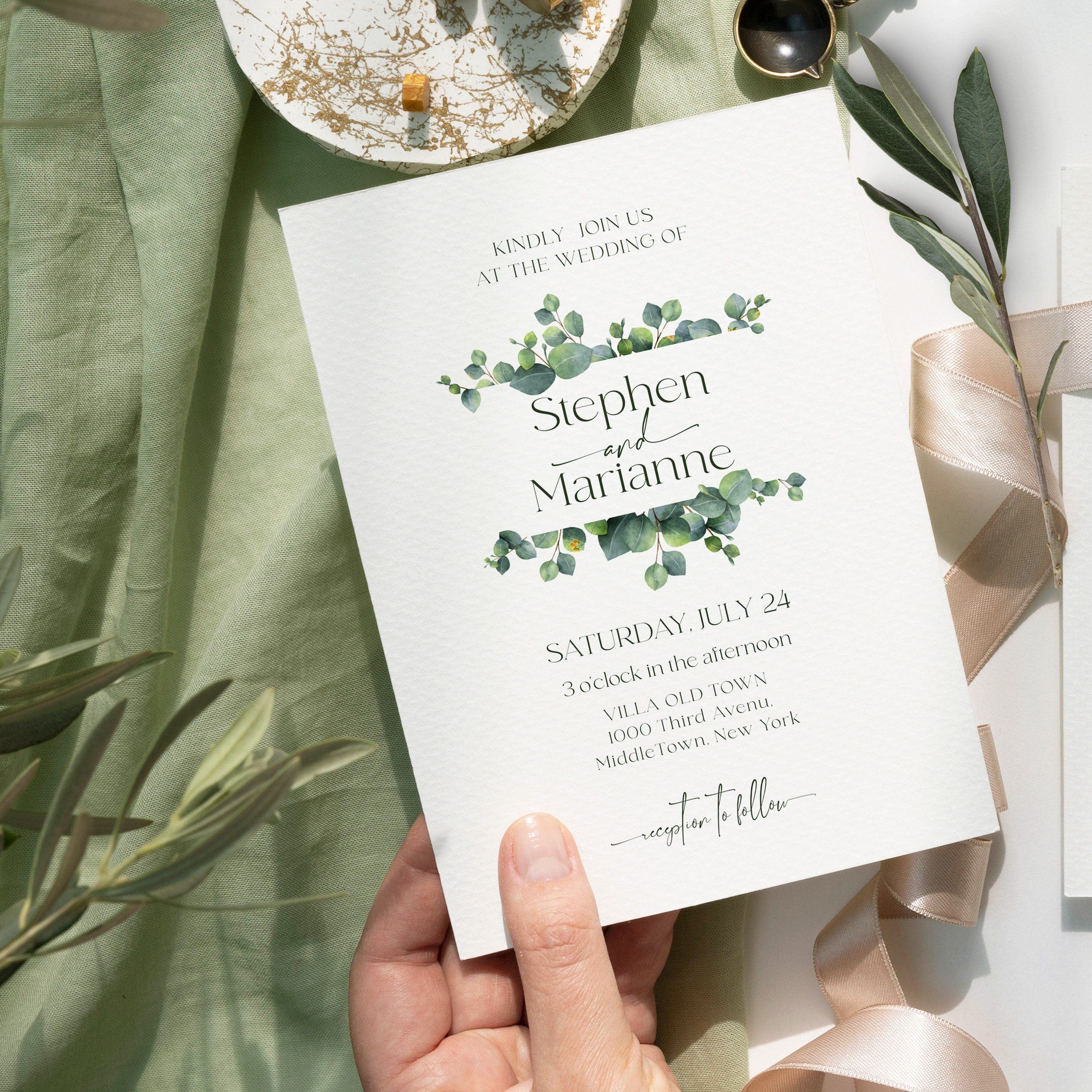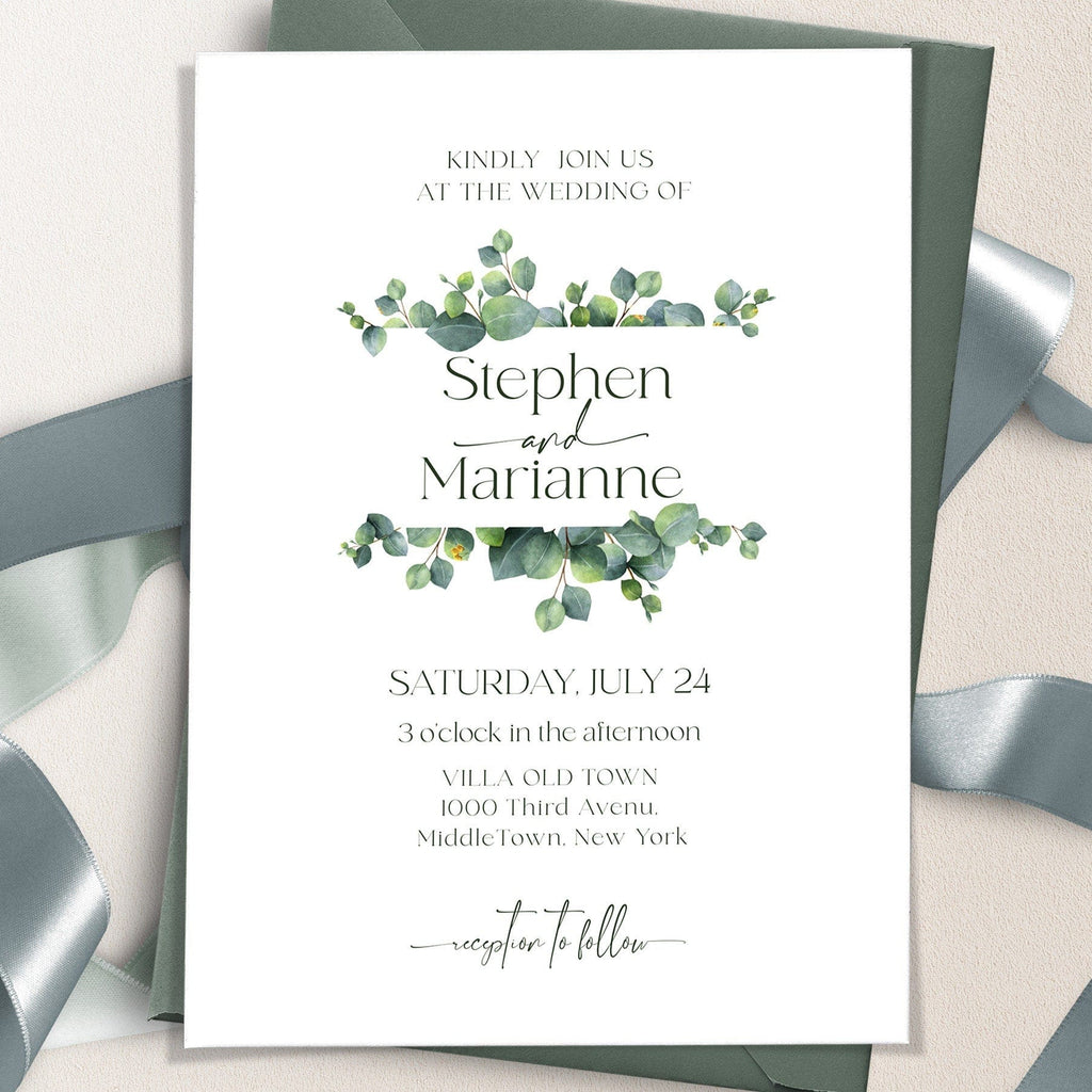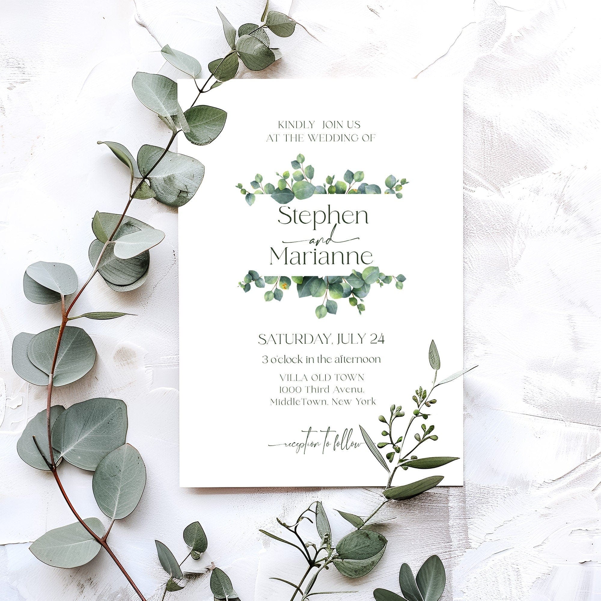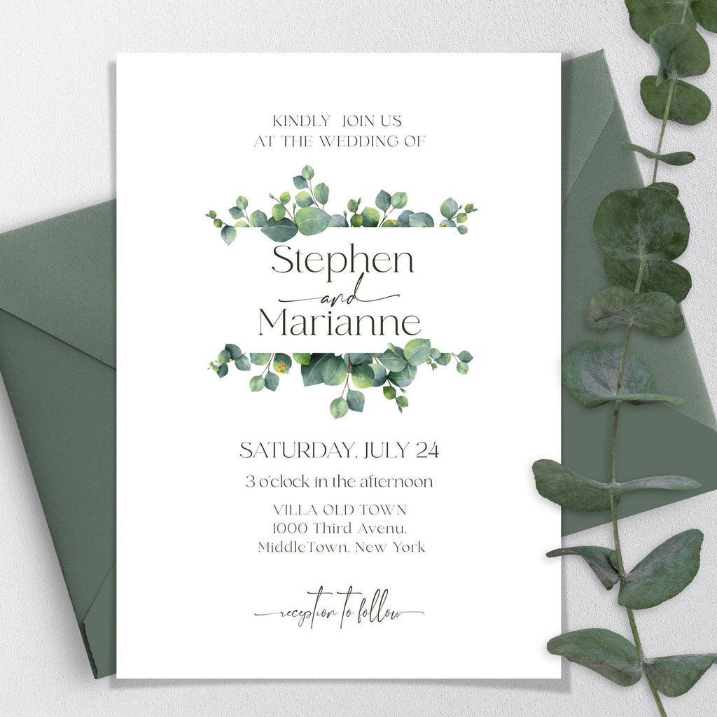 Green Wedding Invitation Card | 3 Printable Items | Eucalyptus Wedding Stationery