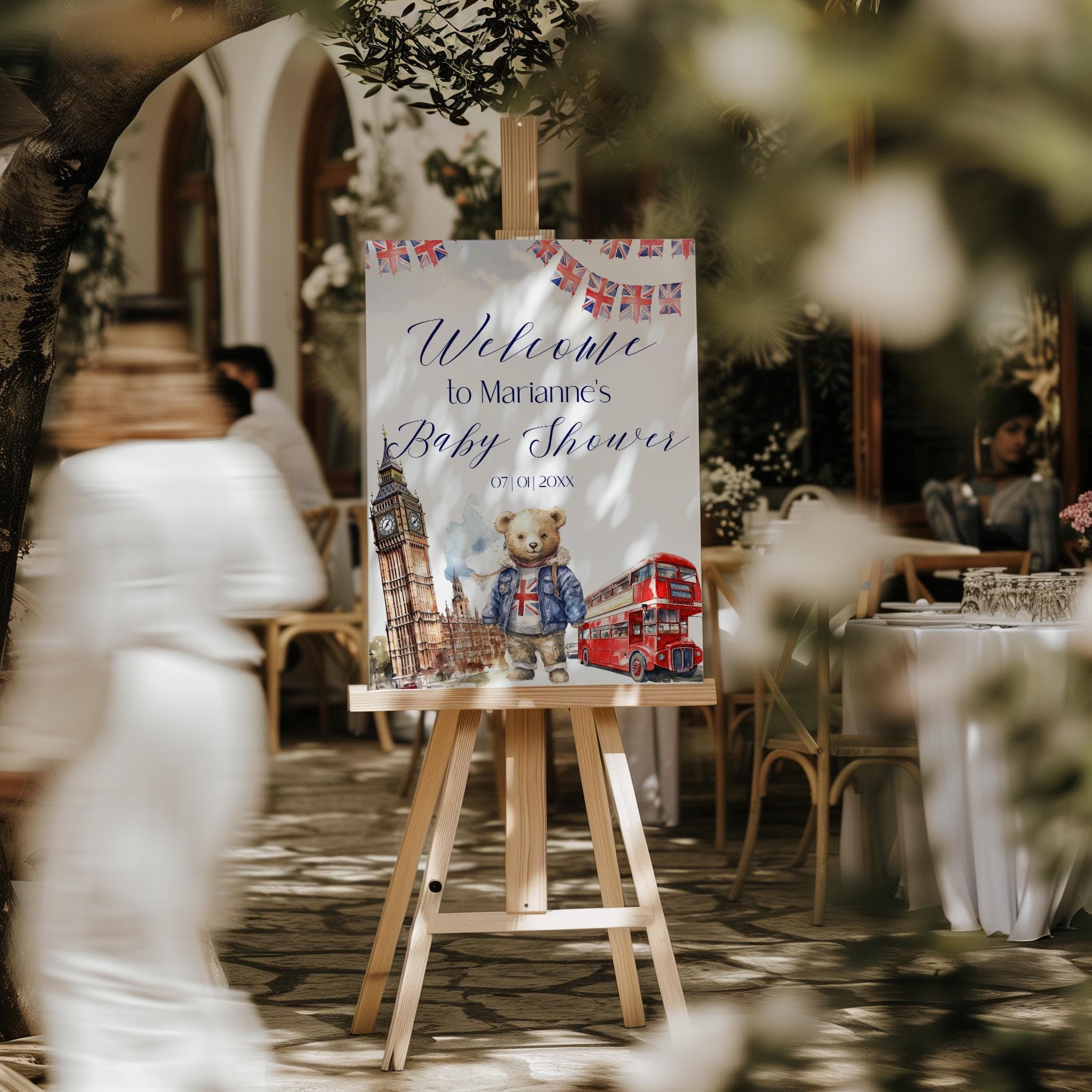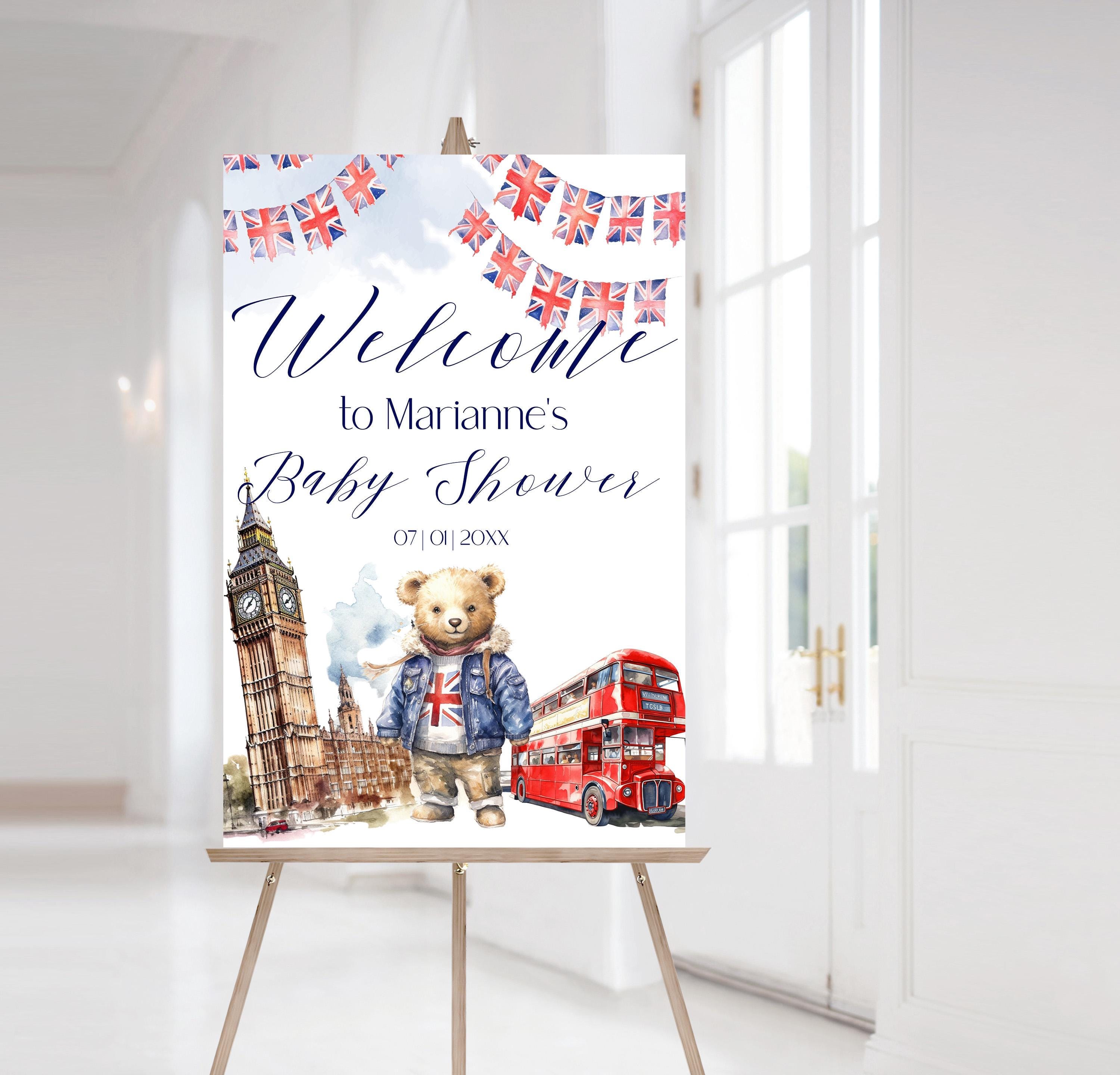 Welcome Baby Shower Signs | 4 Sizes | London Teddy, Big Ben & Red Bus