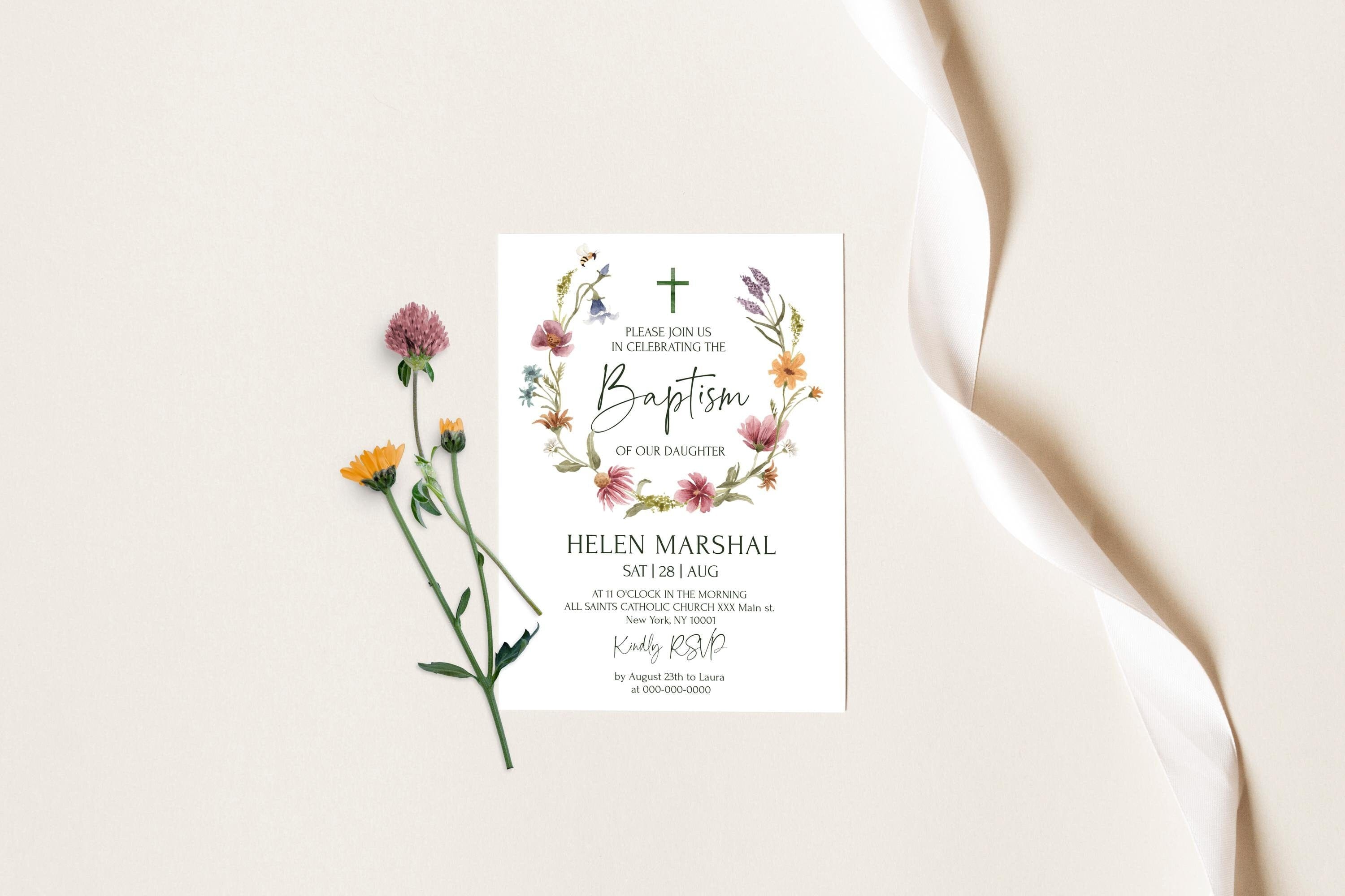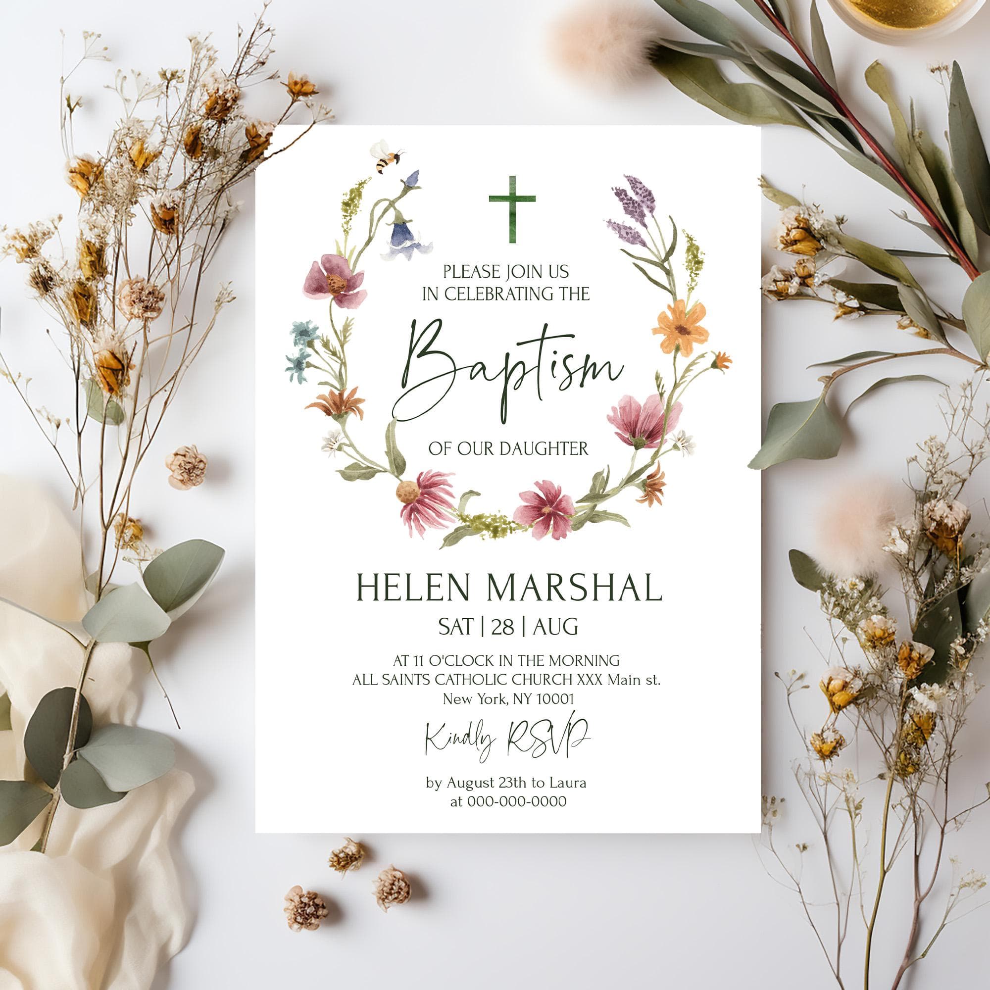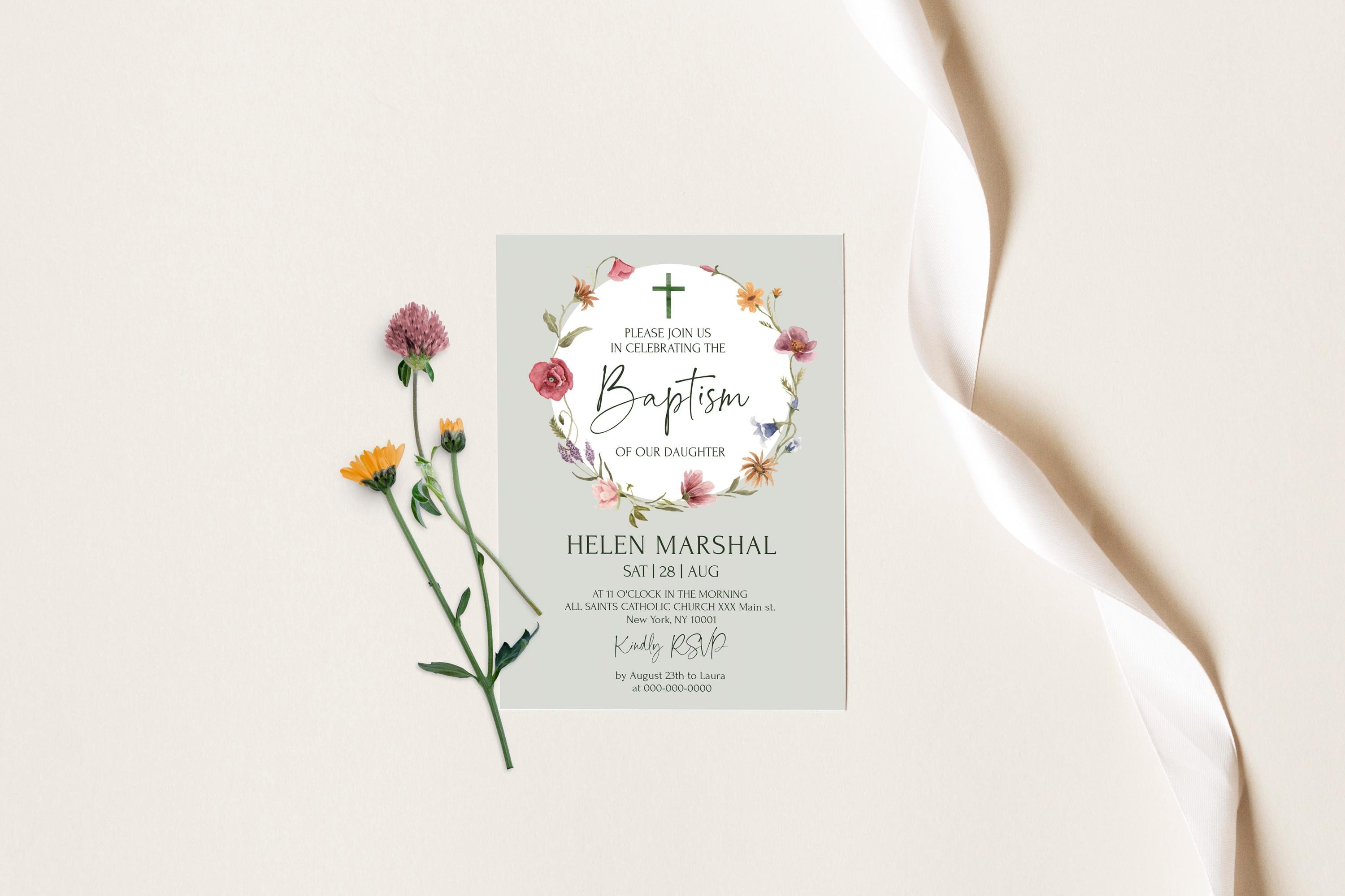 Wildflowers Baptism Invitation Card | 3 Sizes | Editable Baptism Invitations