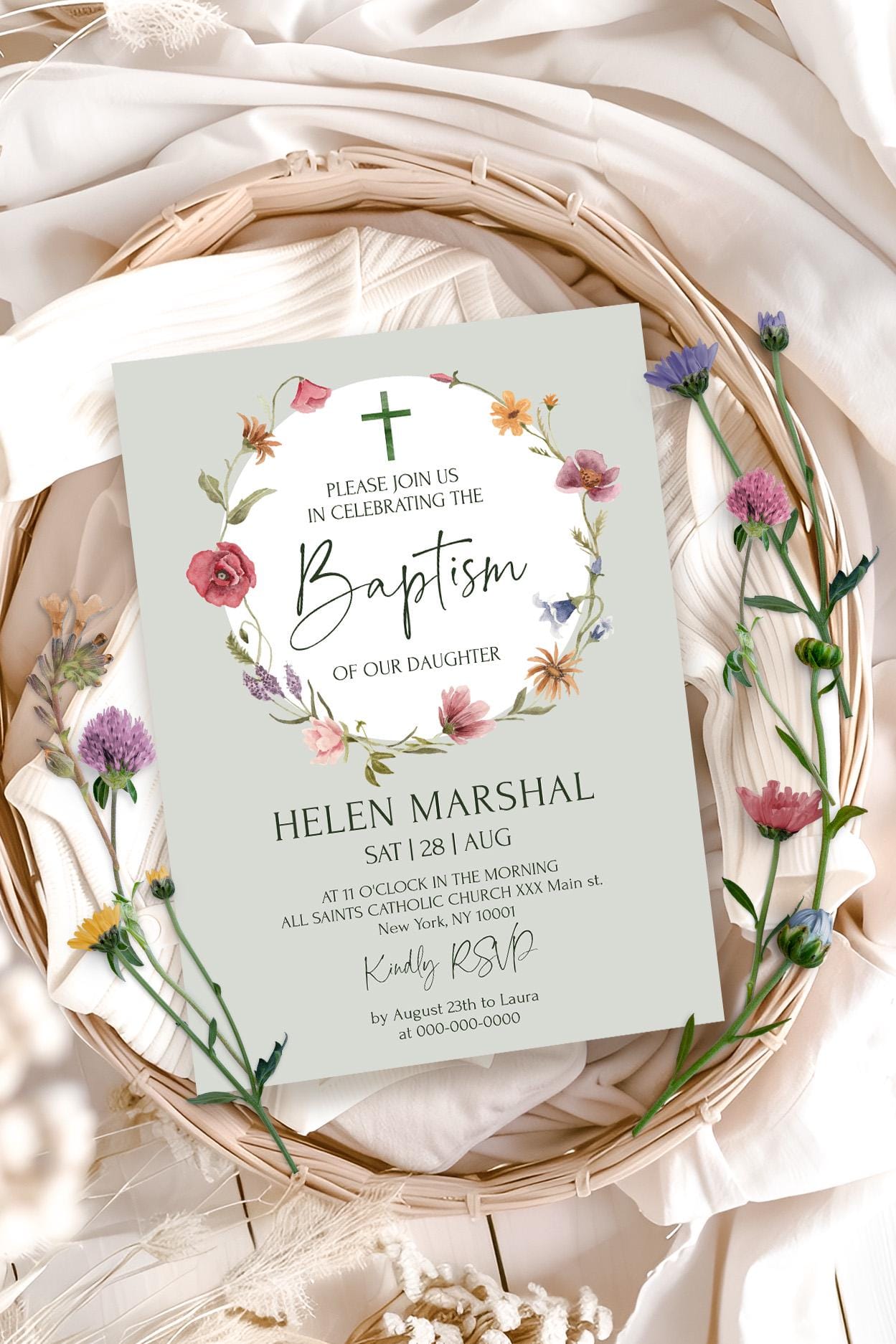 Wildflowers Baptism Invitation Card, EDITABLE Templates